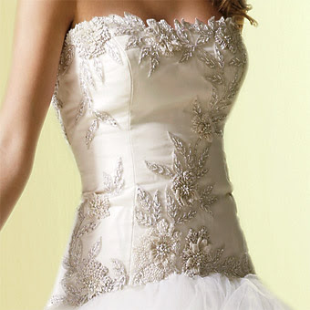 Justina McCaffrey While a bodice may look pretty straight-forward from the outside, like the skirt, it may have a complex inner life of linings, facings, and shaping materials we never see but sense by the way the bodice holds it’s shape. The bodice on a typical wedding gown needs an underlining to give it that sculpted form in addition to becoming a strong foundation with which to attach lace, trim or embroidery. Also, an underlining can hide casements within the bodice for boning, a material used to hold that strapless bodice up. We’ll discuss the under structure of your bodice as well as skirt in more detail later. Until then realize most bodices whether draped or closely fitted to your body, frequently have some kind of foundation of reinforcement beneath. Here are a few bodice treatments to consider